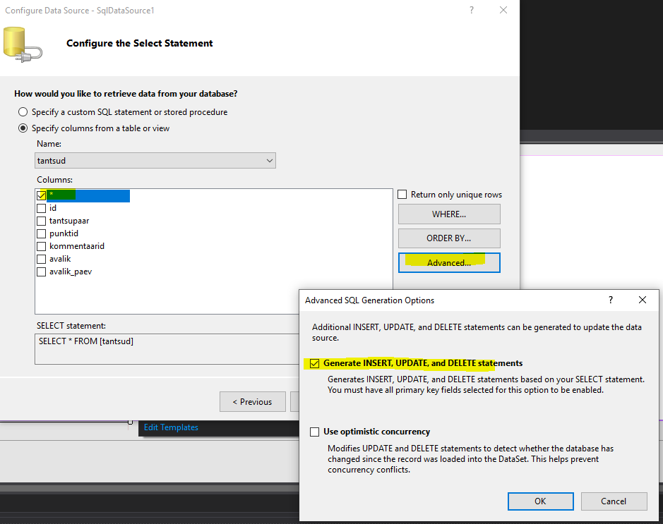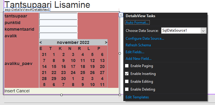 Тут также проверяем Data Source и ставим галочку на Inserting