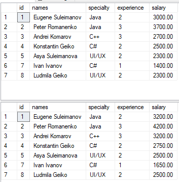 VALUES(7, 'Ivan Ivanov', 'C#', 1, 900);